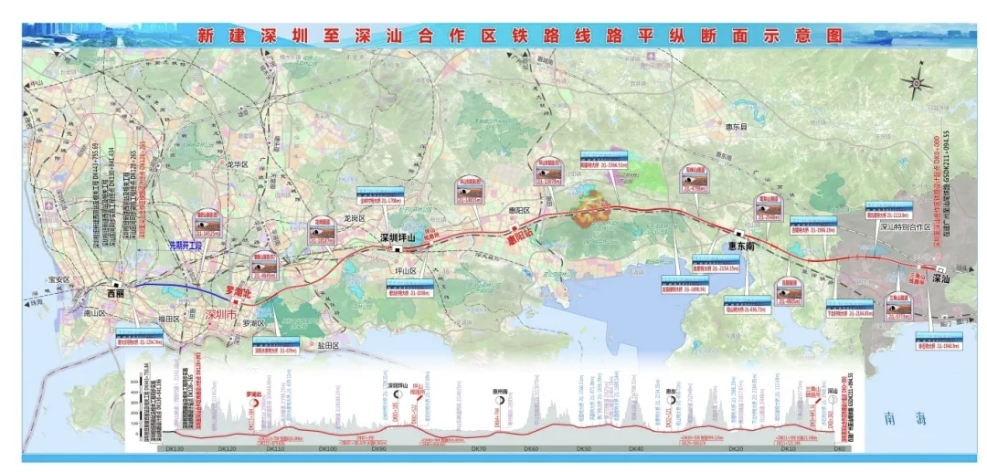 深汕高铁作为粤港澳大湾区交通建设重点工程,起于深圳枢纽西丽站,终至深汕特别合作区,并引入广汕高铁深汕站,沿途贯穿深圳多个区域以及惠州部分地区,沿线设 6 座车站,双线隧道 18 座,大中桥梁 37 座。
