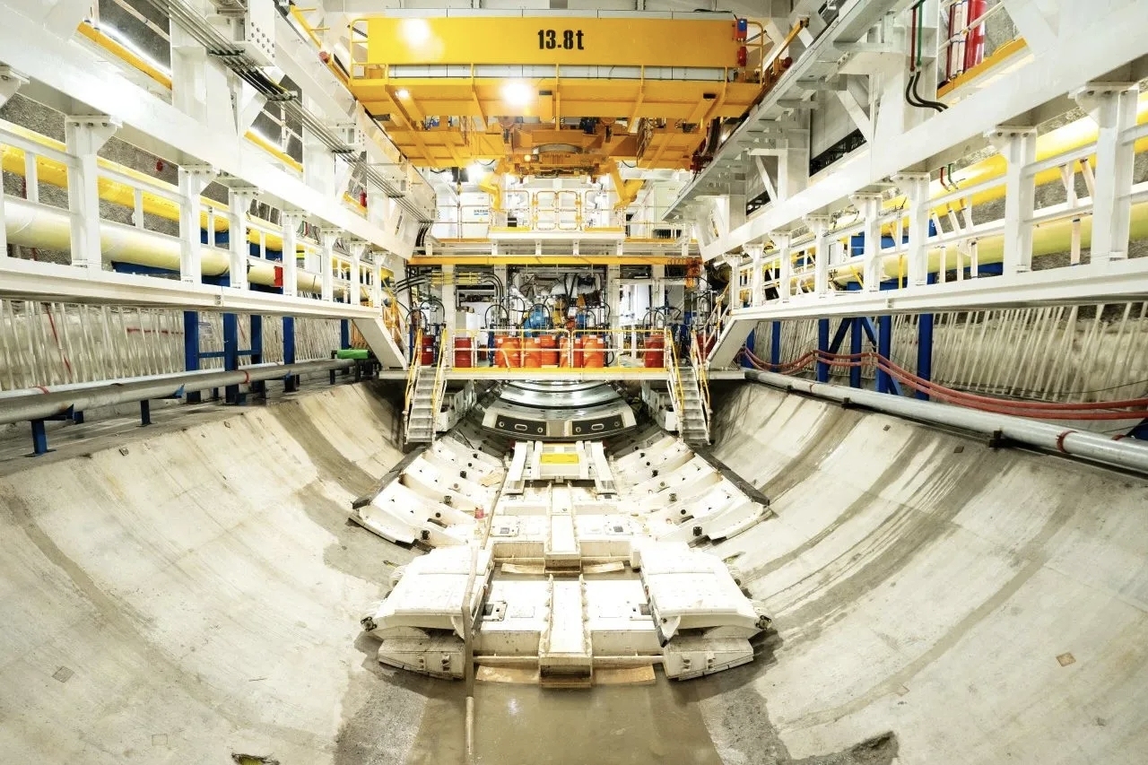 深汕高铁4标位于深圳坪山区与惠州大亚湾区,此次始发的“坪山东3号”盾构机开挖直径达14.34米,整机总长约121米,总重量约3678吨,装机总功率约9478千瓦。